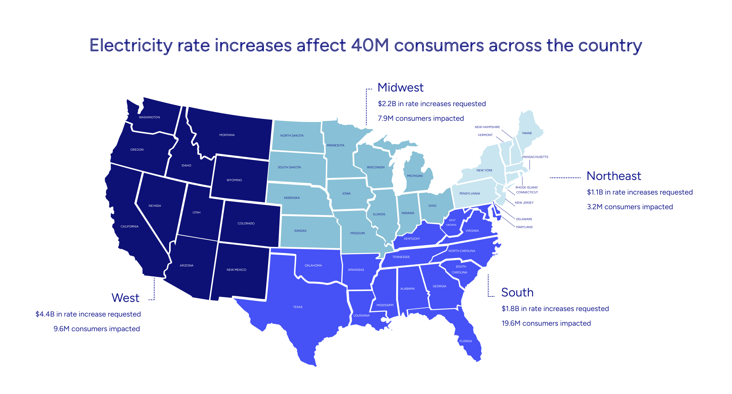 - Rising electricity prices. Utilities have already requested $29 billion in rate increases for just the first half of this year, hitting 40 million Americans. Already-rising retail electricity prices will now get pushed higher, which will both support higher rooftop lease and PPA rates.